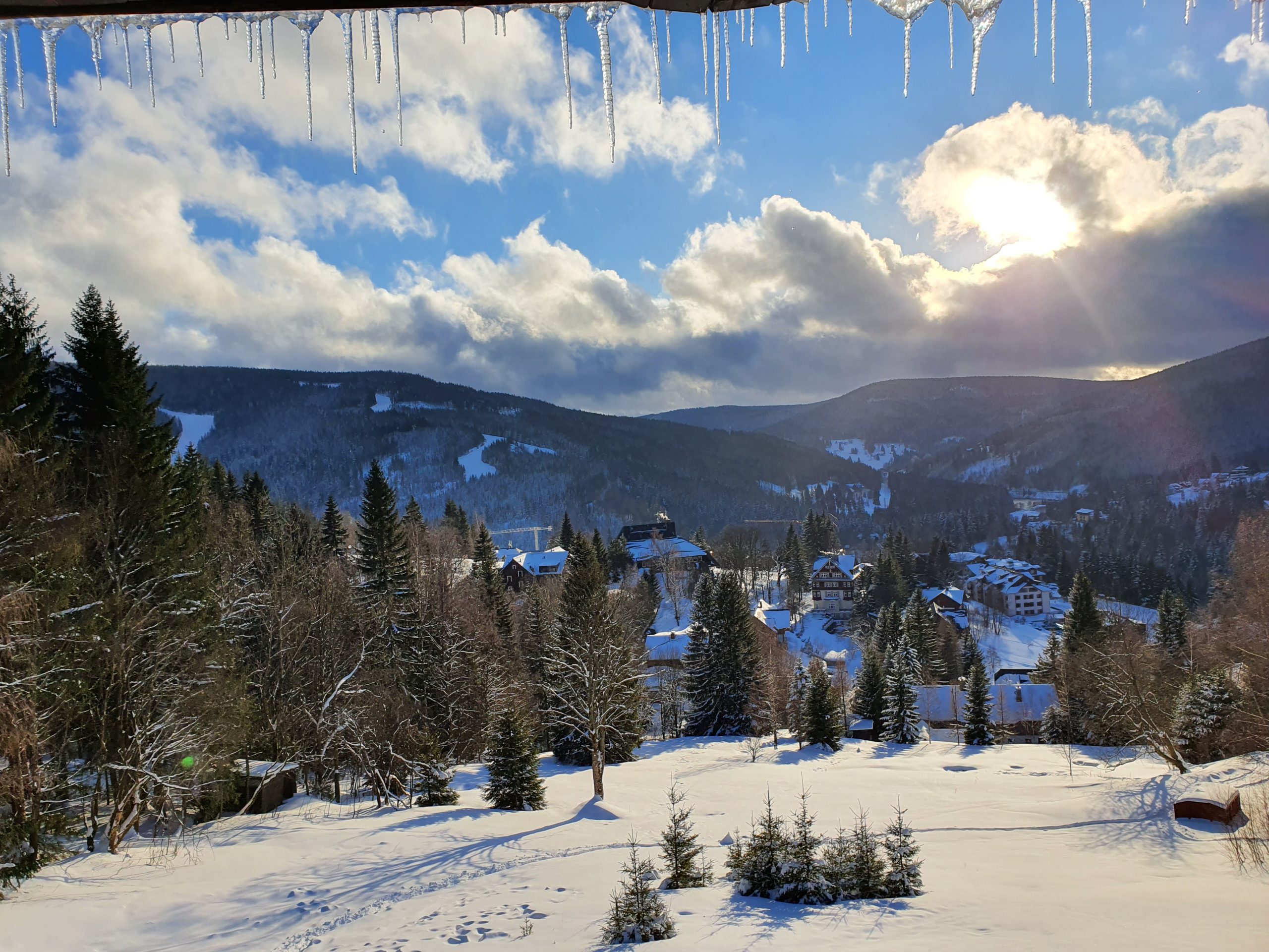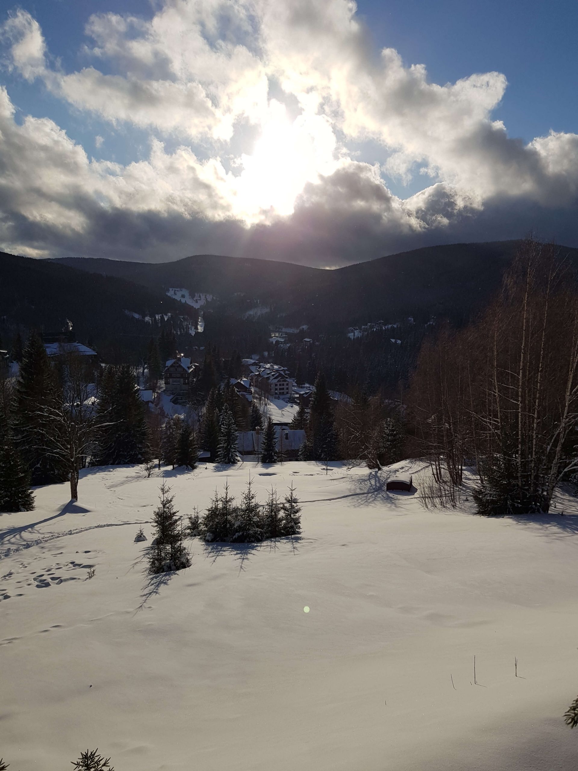 In zwei Autos fuhren wir durch Polen nach Spindleruv Mlyn Ski Resort. Nach unserer Ankunft checkten wir im Hotel Horni Pramen ein. Der Weg zum Hotel führte uns durch ein verschneites Wäldchen.